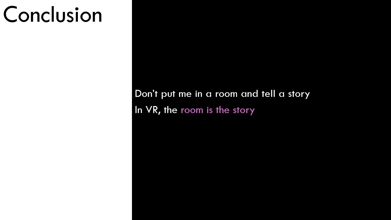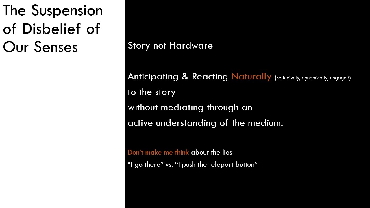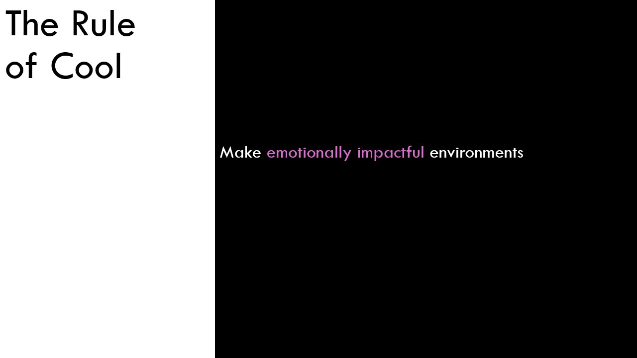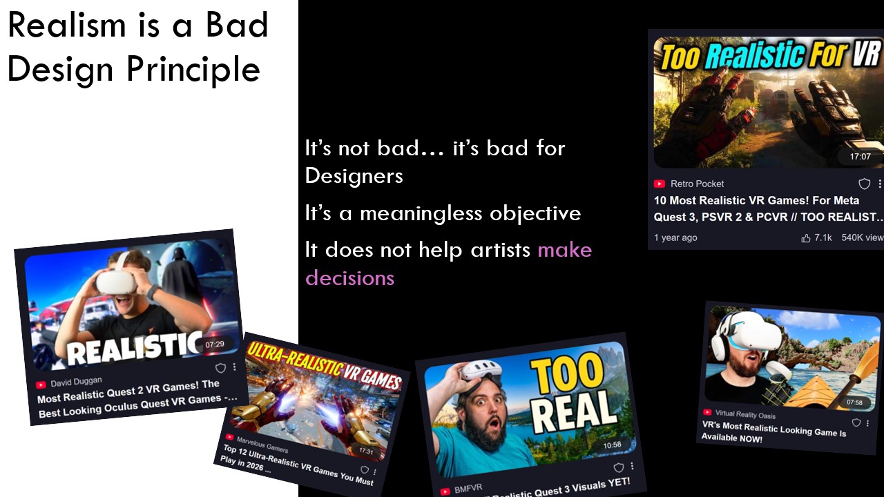 We want to create worlds, a virtual reality, that is not fooling them into thinking it’s realistic, but is getting out of the way to let them directly engage, direcly react, and be receptive to our story.