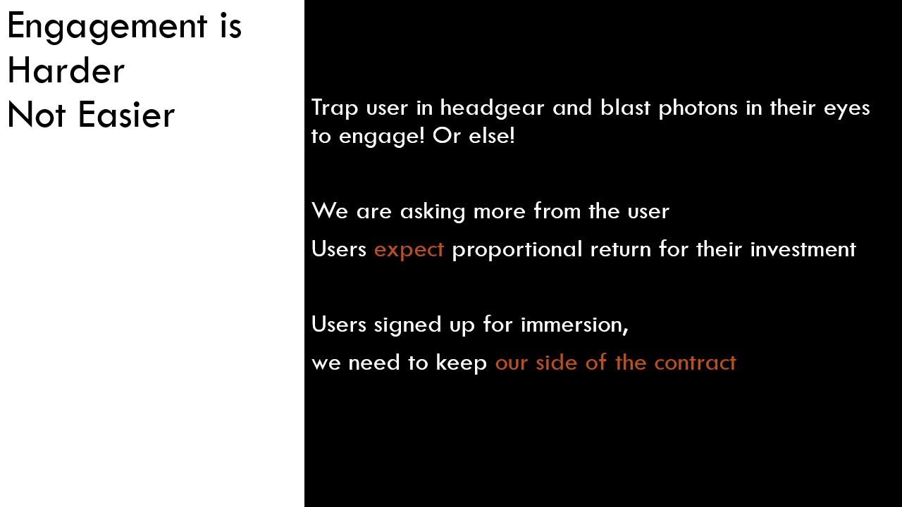 Like tv vs. movie vs. netflix reality junk show. VR is high on that spectrum of how much attention and focus the user has to give us.