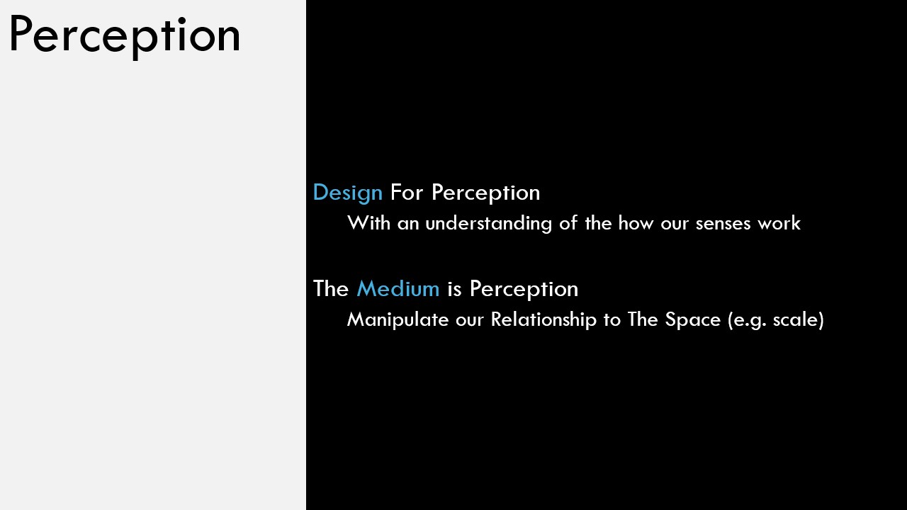 Perception - What are the things our senses need to understand a space? If we can understand it instantly, reflexively… that’s (part of) immersiveness.