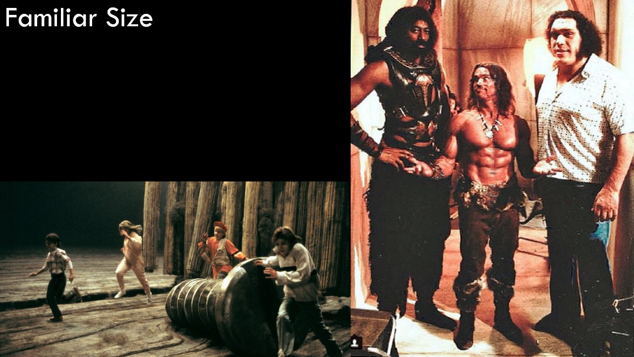 Honey I shrunk the kids: basically ‘familiar size’ with the prop department is it’s only trick to establish scale. It’s a good one!