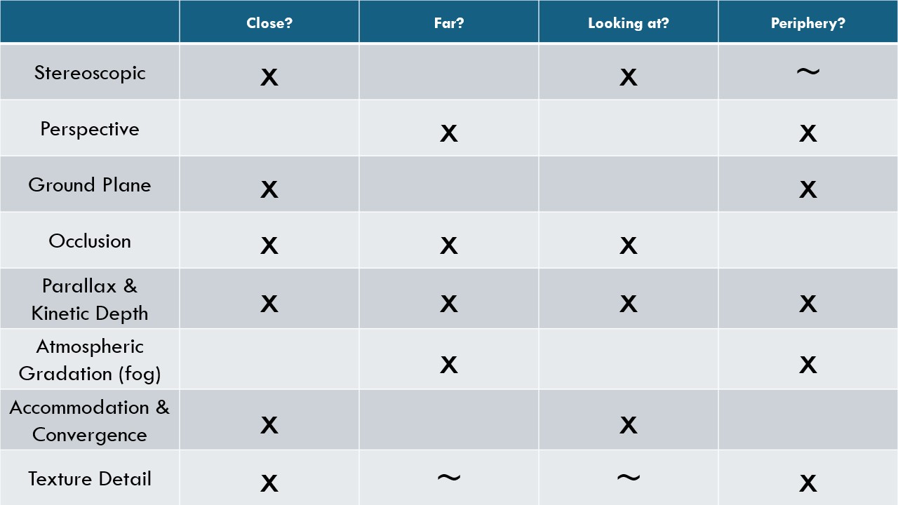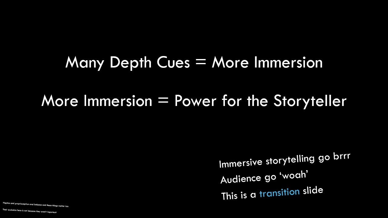 More depth cues equals more better environments, because it makes for more understandable - by our reflexes and intuition and senses. That’s less understanding that the actual thinking has to do, so the user can stay engaged and caring about the story.