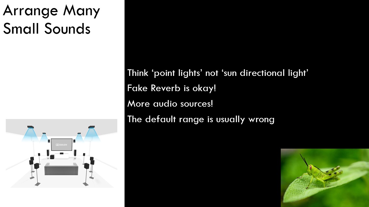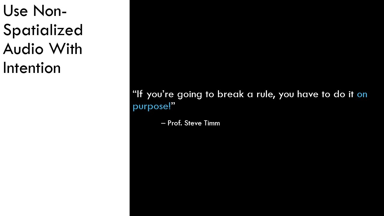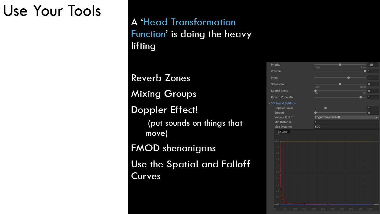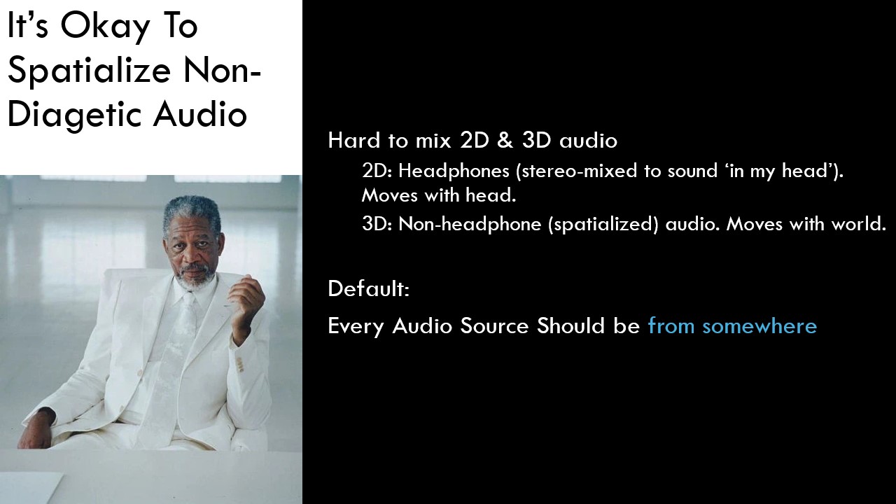 Not spatializing audio is slapping headphones on your user and trying to convince them that those sounds are part of this environment. It’s not very easy.